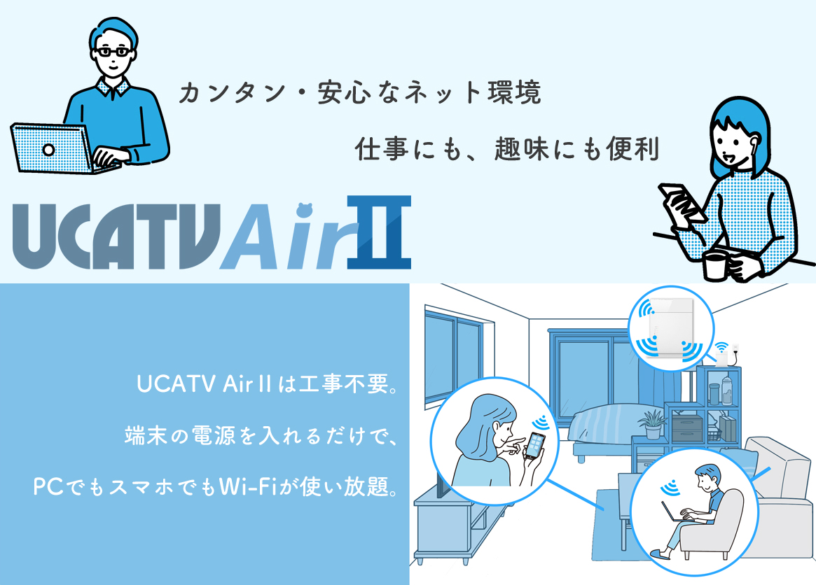 「UCATV AirⅡ(ユーキャットブイ・エアー・ツー)」は地域BWAを利用したインターネットサービスです。