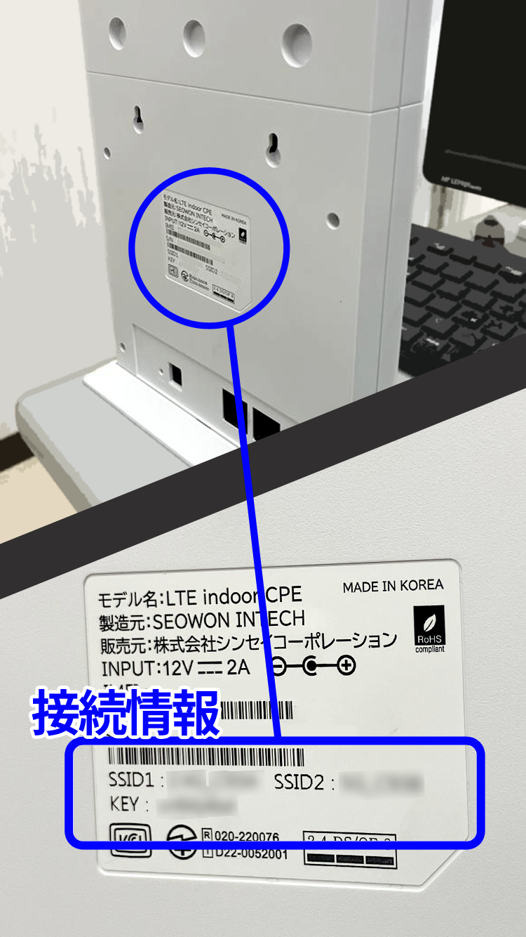 端末の側面(電源端子のある面)で無線LAN接続情報(SSIDおよびKEY)を確認する