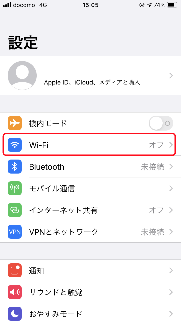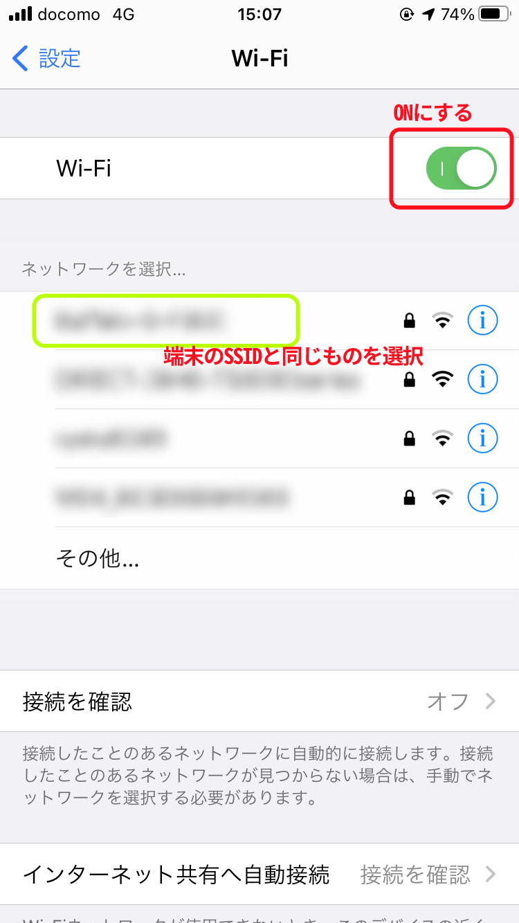 Wi-Fiを[ON]にして、端末に記載されているSSIDと同じものをタップ