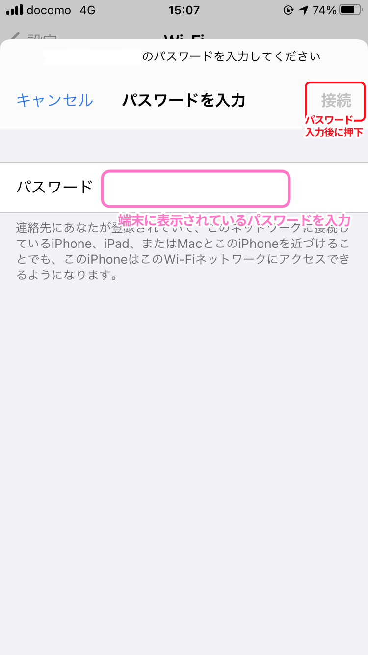パスワードの欄に、端末に表示されているパスワード(KEY)を入力して[接続]をタップ