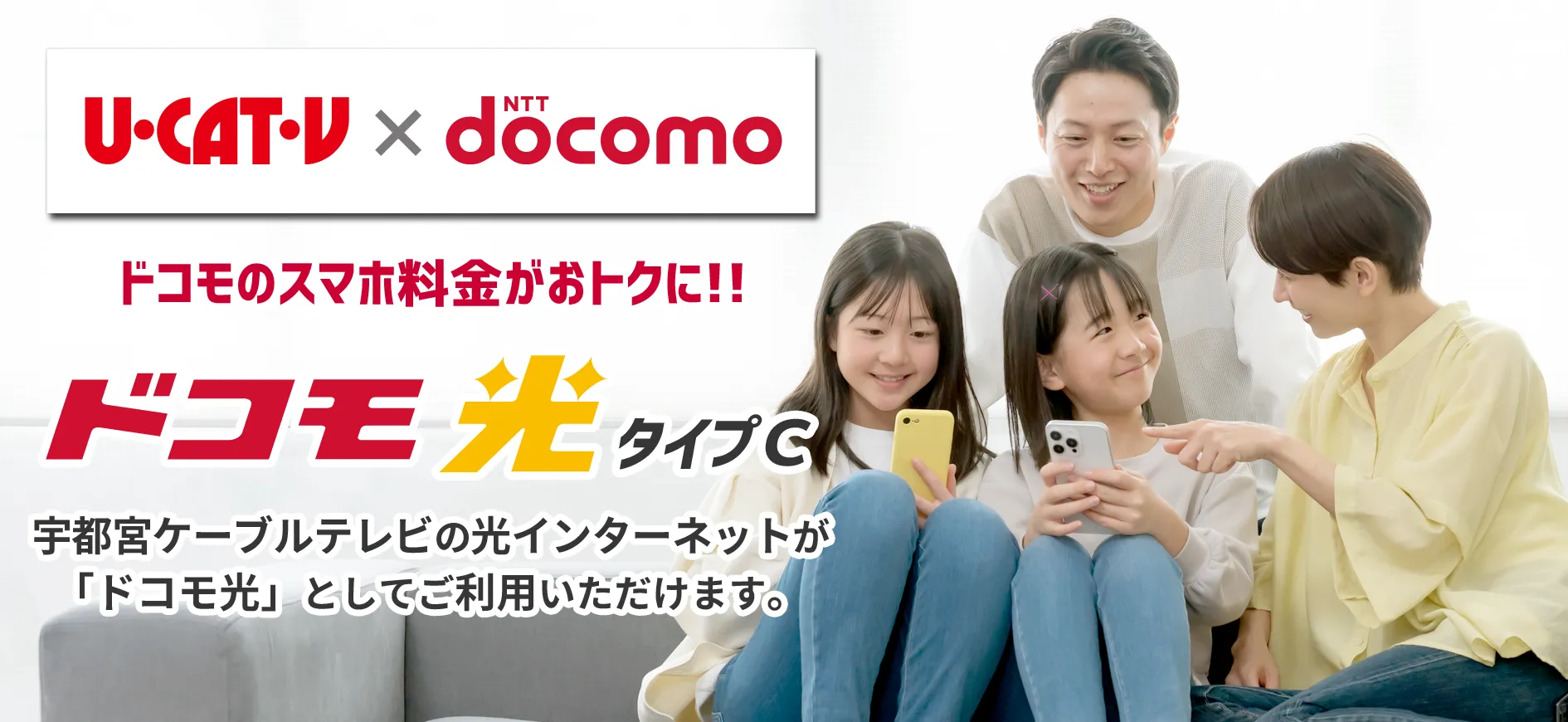 「ドコモ光タイプC」は、宇都宮ケーブルテレビの光ファイバー回線設備をそのままに、NTTドコモが提供する光インターネットサービスです。
