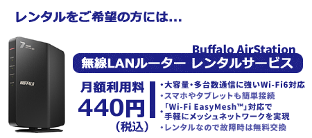 レンタルは無線LANルーター親機のみになります。お使いのパソコンに無線子機の機能が内蔵されていない場合は別途ご用意ください。 |