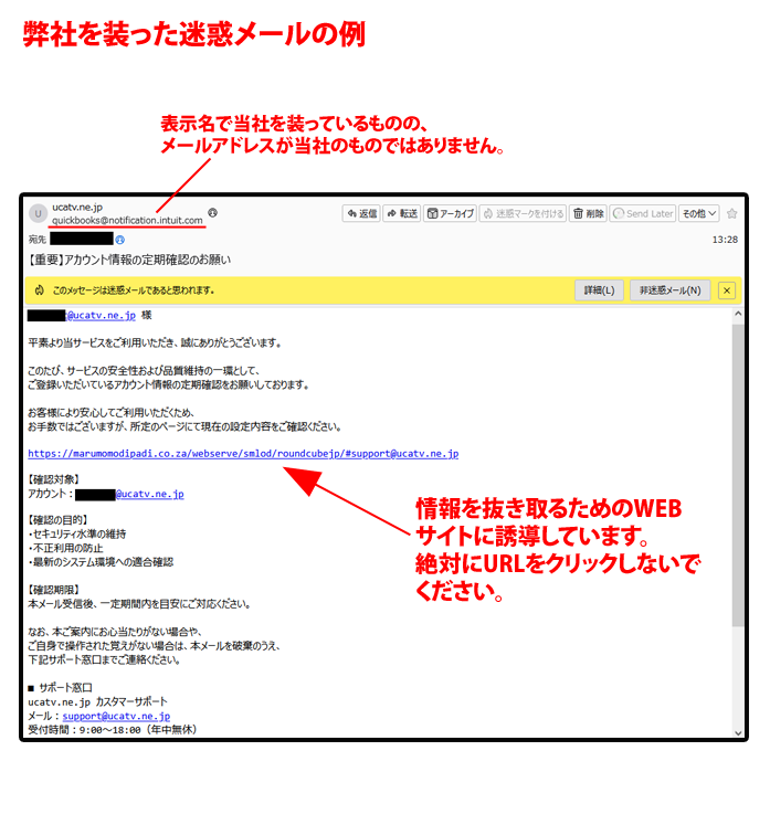 弊社を装って詐欺ページに誘導し、個人情報を抜き取ろうとする悪質なメールが流行しております。