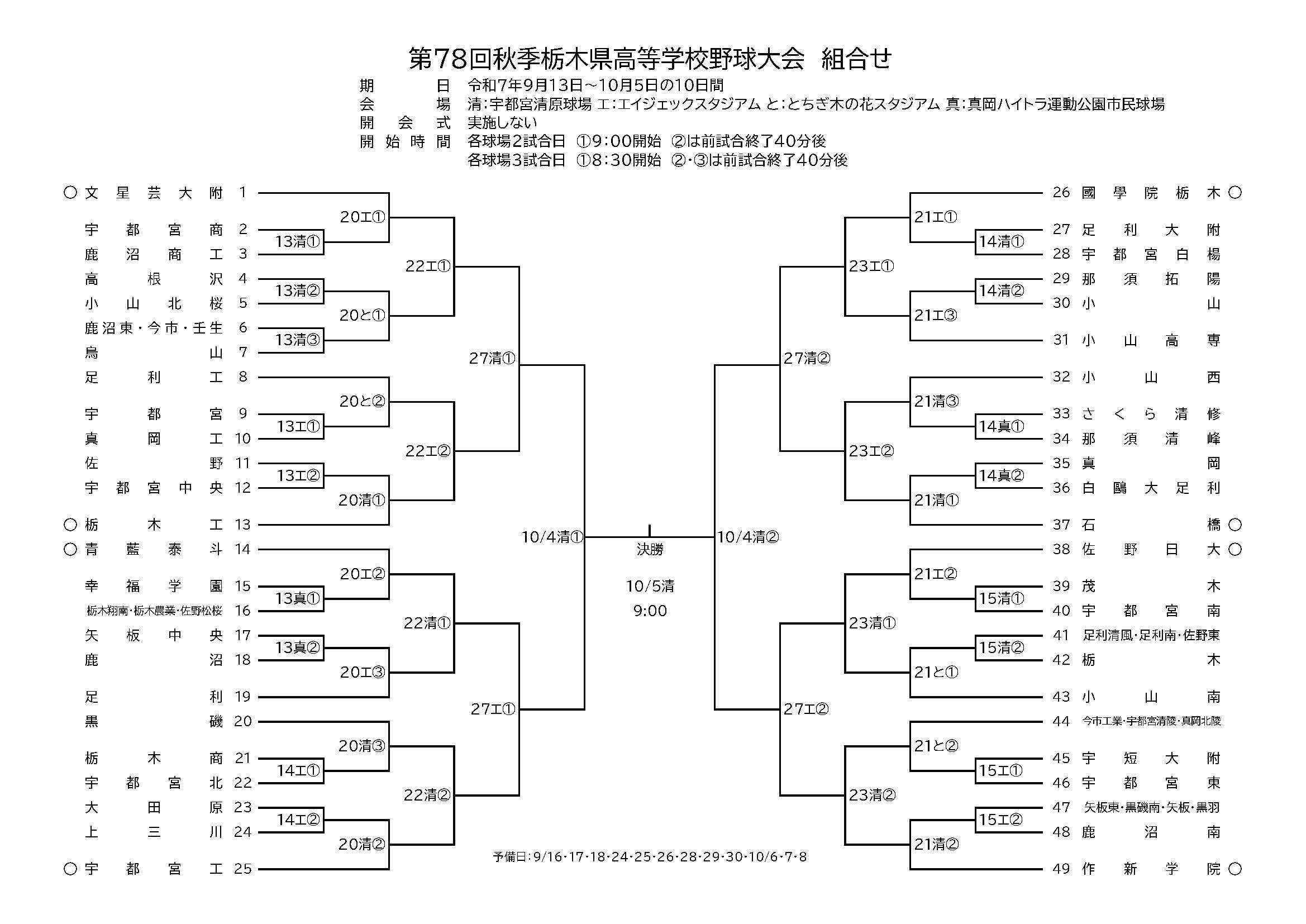 ■ 放送ch 宮チャンネル(宇都宮市) / いちごチャンネル(真岡市) :地上デジタル放送111ch(リモコン11) ■ 放送予定 ・9/27(土) 第1試合 準々決勝 9:00~ 第2試合 準々決勝 前試合終了40分後 *いちごチャンネルは午後7時からの録画中継のみとなります ・10/4(土) 第1試合 準決勝 9:00~ 第2試合 準決勝 前試合終了40分後 *いちごチャンネルは午後7時からの録画中継のみとなります ・10/5(日) 決 勝 10:00~ ※天候や試合状況により、試合開始時間や日程が変更になる場合がございます。 ※「エイジェックスタジアム」にて行われる試合の中継はございません。 ■ トーナメント表(※クリックでPDF表示)