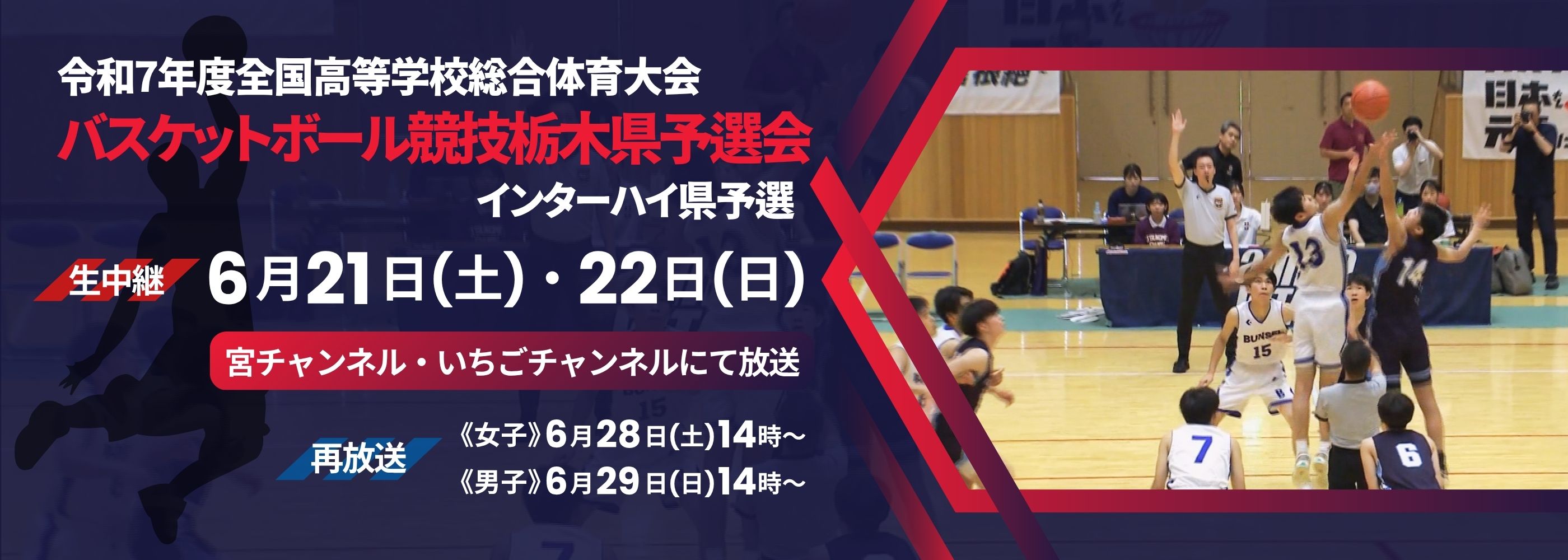 | 2025年6月21日(土)・22日(日)に行われる「令和7年度 全国高等学校総合体育大会バスケットボール競技栃木県予選会(インターハイ県予選)」の準決勝・3位決定戦・決勝、男女計8試合をコミュニティチャンネルで生中継いたします。 |