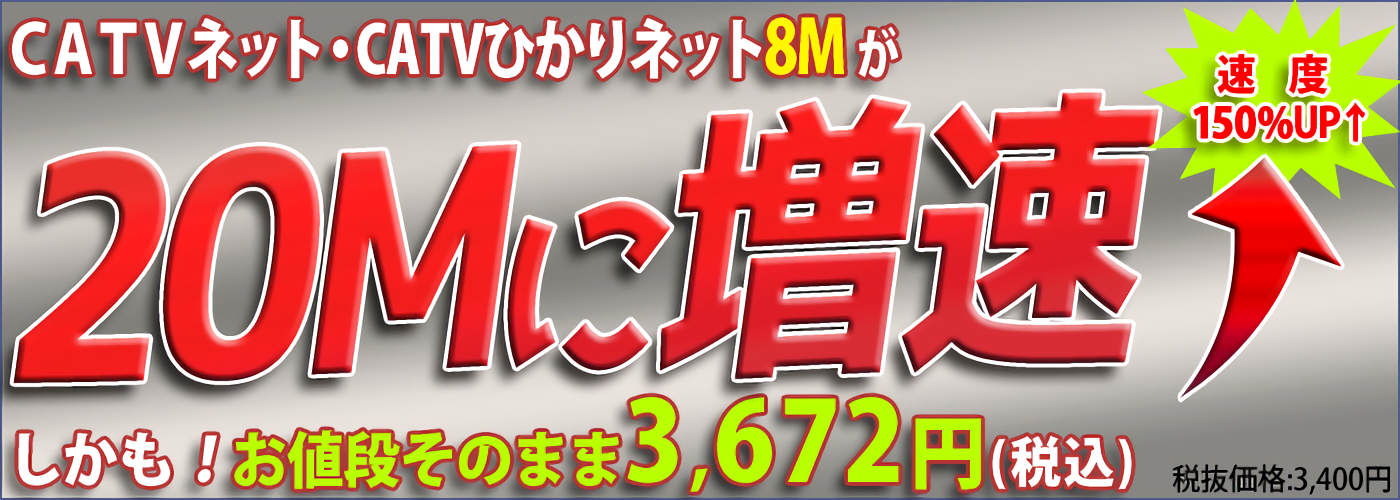 2017/4/1より当社インターネットサービス「CATVネット8M」・「CATVひかりネット8M」が、お値段そのままで20Mに増速します! 速度はおよそ2.5倍となりますので、メールやホームページの閲覧はもちろん、ネットショッピングや動画視聴なども、さらに快適にお楽しみ頂けるようになりました! 契約約款・料金表等、詳細はこちらをご確認下さい。 |