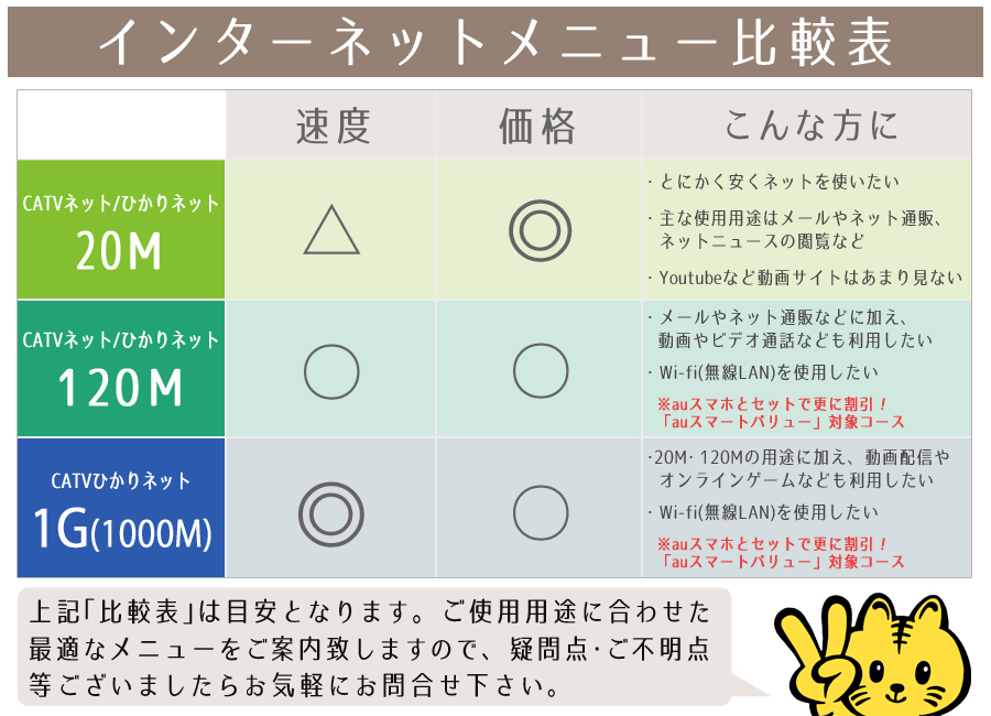 プロバイダ料・通信料・モデムレンタル料込み、メールアドレス1つ無料 ※CATVネットおよびCATVひかりネット20Mは、ベストエフォート型サービスです。実際の使用における一定の通信速度を保証するものではありません。また、お客様のご利用機器、設定状況、LAN環境などにより、通信速度は異なります。 ※平成29年3月31日以前より「CATVネット8M」「CATVひかりネット8M」をご利用頂いていたお客様については、自動的に「20M」へ増速されます。特に手続きや工事等は必要ございません。 ※現在のご契約のコース変更はこちらのページより承ります。 |